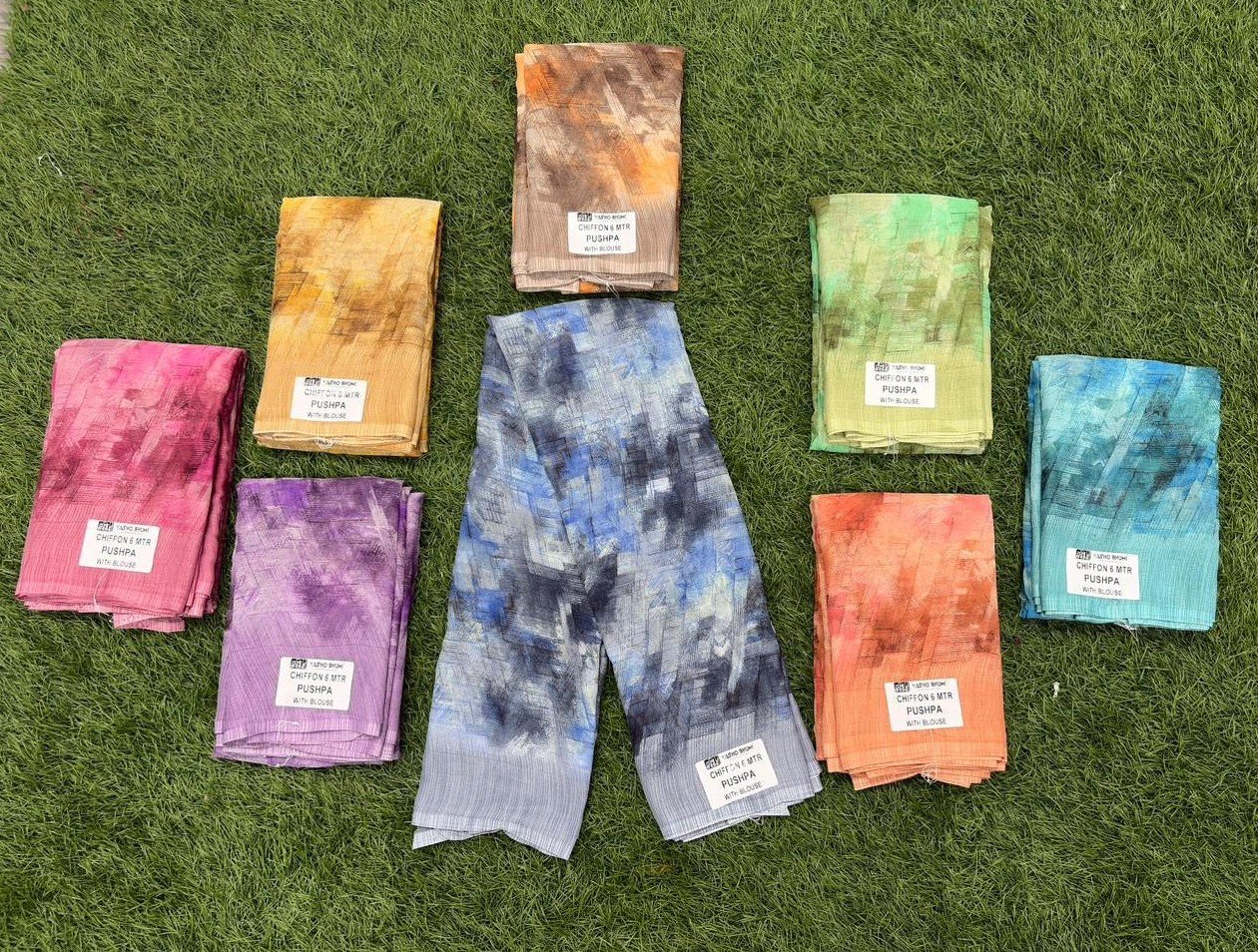 YB-pushpa nn-5. Chiffon Saree with finalized set quantity. Each saree priced at ₹180. Set of 8 sarees. Total price ₹1440.