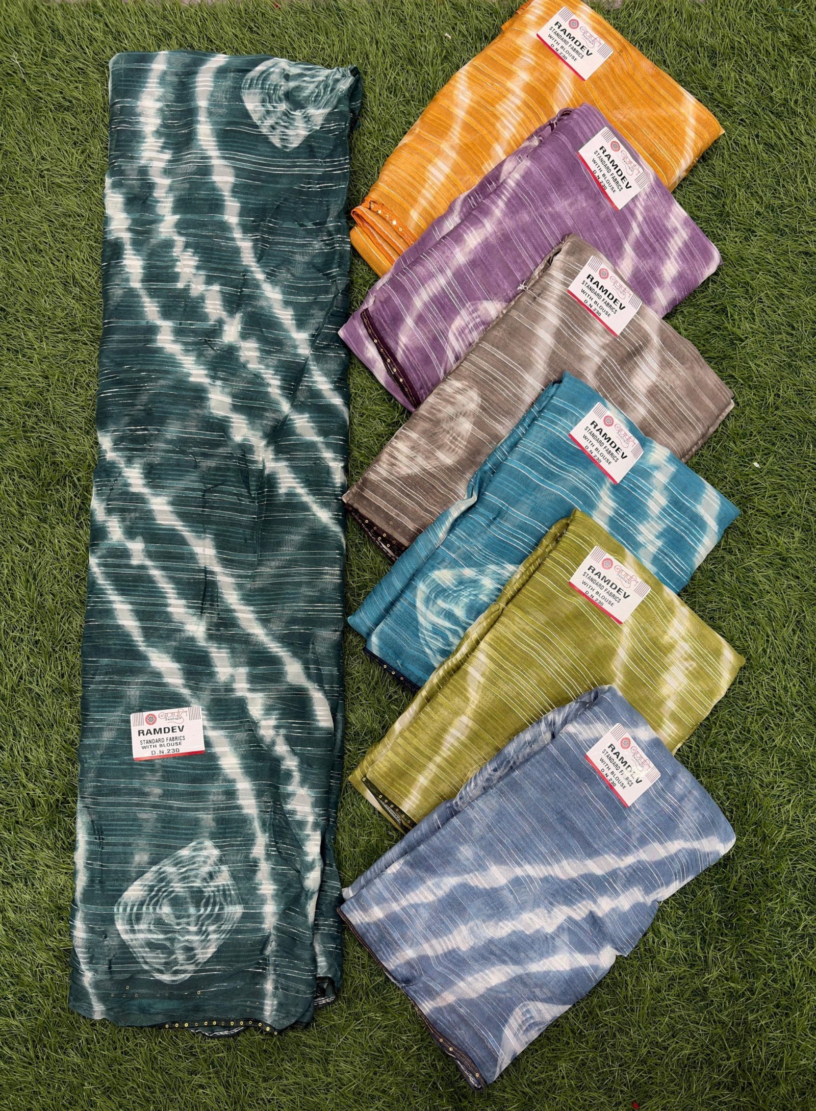 YB-RAMDEV NX(astha Jari). Saree with finalized set quantity. Each saree priced at ₹235. Set of 7 sarees. Total price ₹1645.