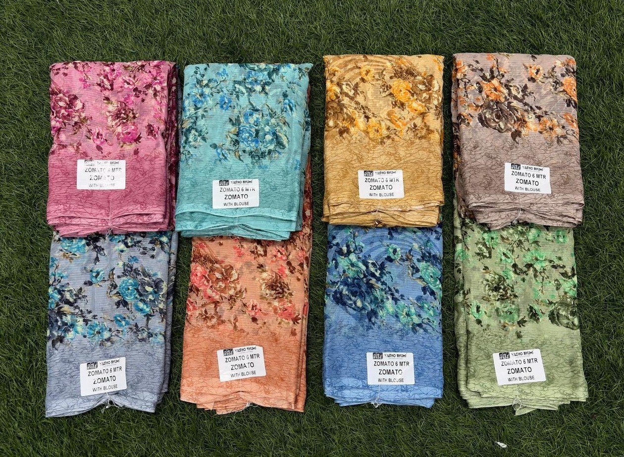 YB-zomato nn-5. Printed Saree with finalized set quantity. Each saree priced at ₹185. Set of 8 sarees. Total price ₹1480.